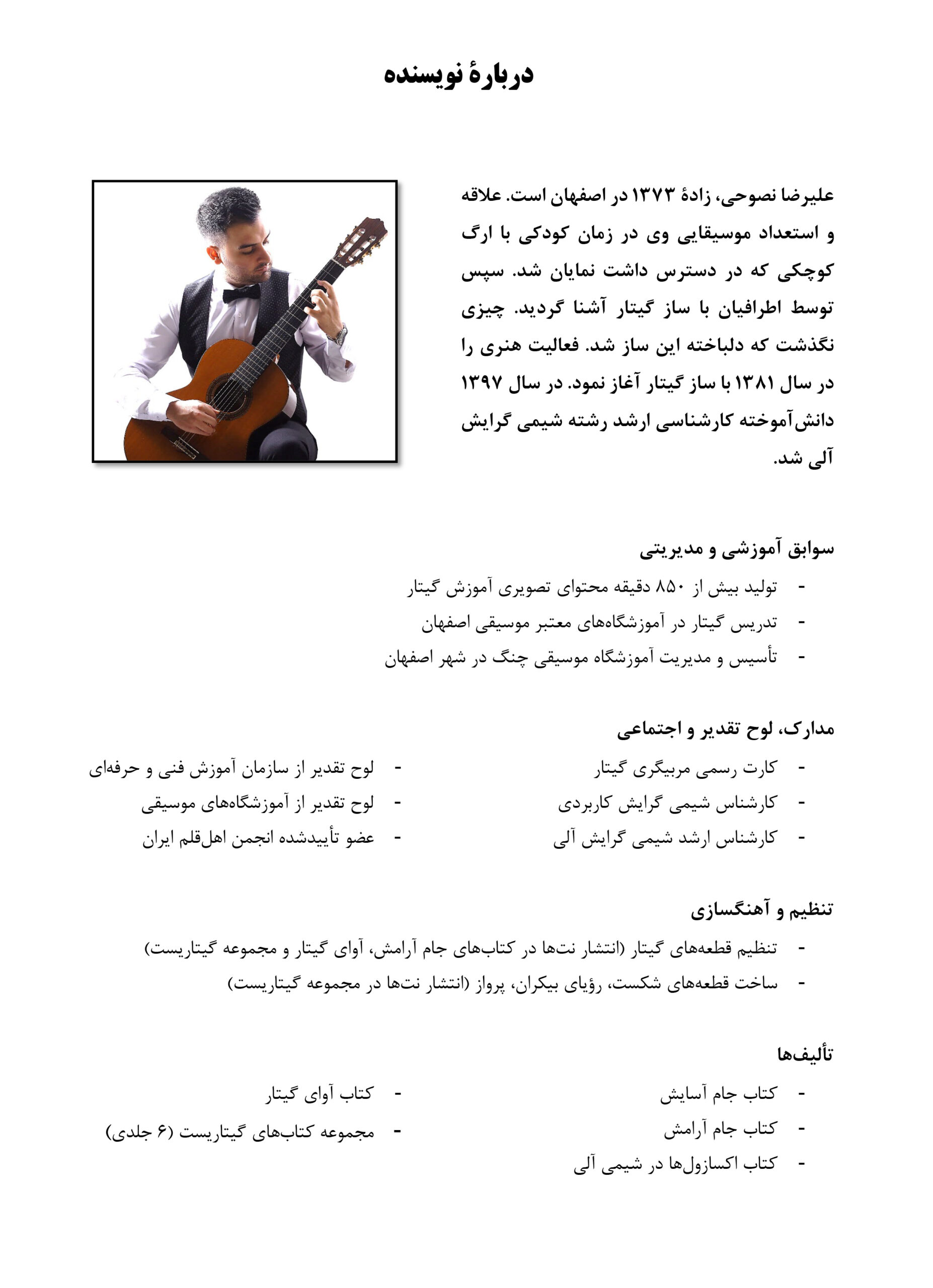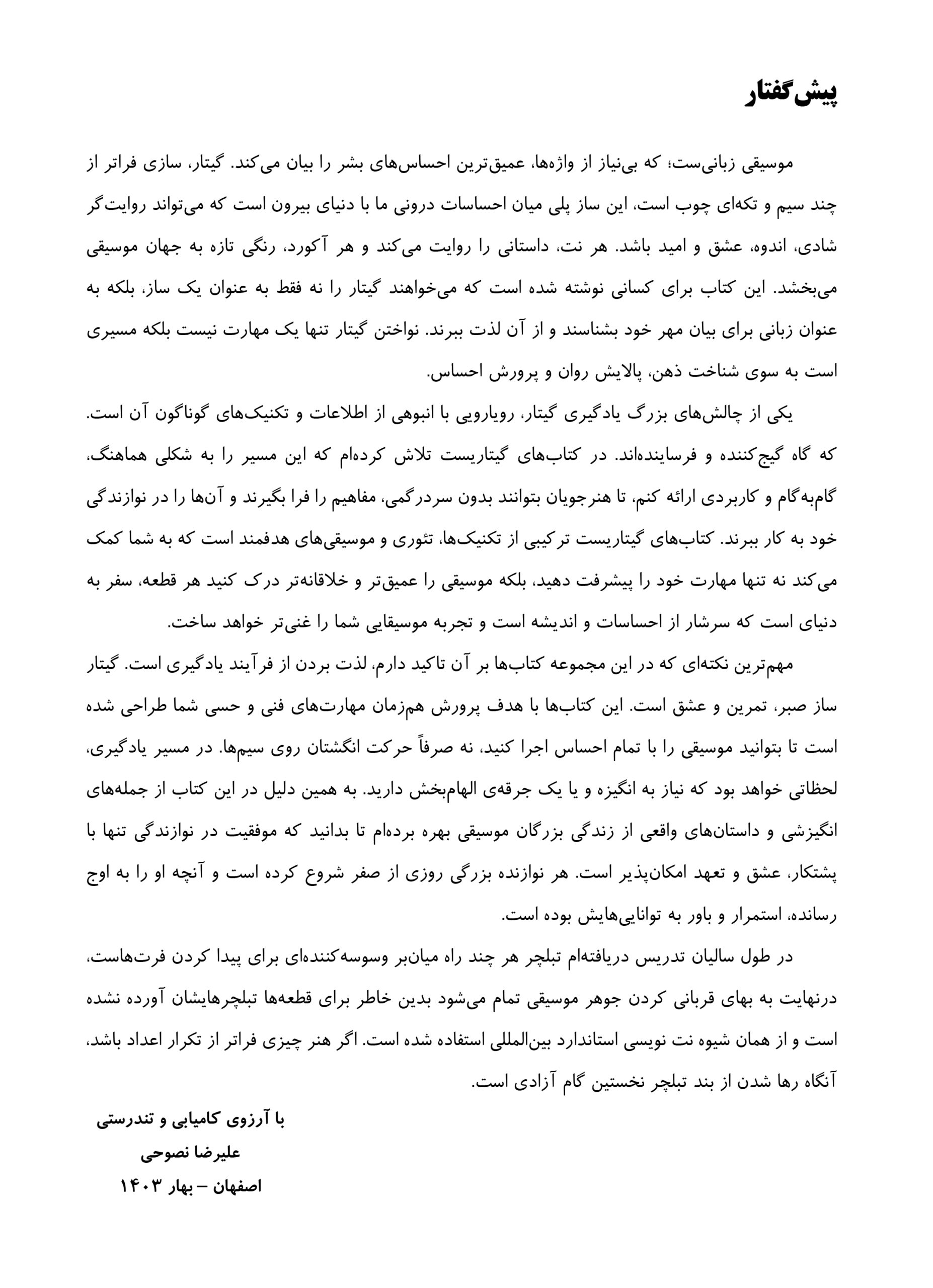 تمرینهای متنوع: کتابها شامل تمرینهای متنوعی هستند که به شما کمک میکنند تا مهارتهای خود را در زمینههای مختلف نوازندگی گیتار بهبود بخشید.